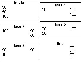 La sequenza è : Prima i 2 da 50 kg, poi torna quello da 50 e va quello da cento, poi torna ancora uno da 50 e i due da 50 tornano infine insieme dall'altra parte.