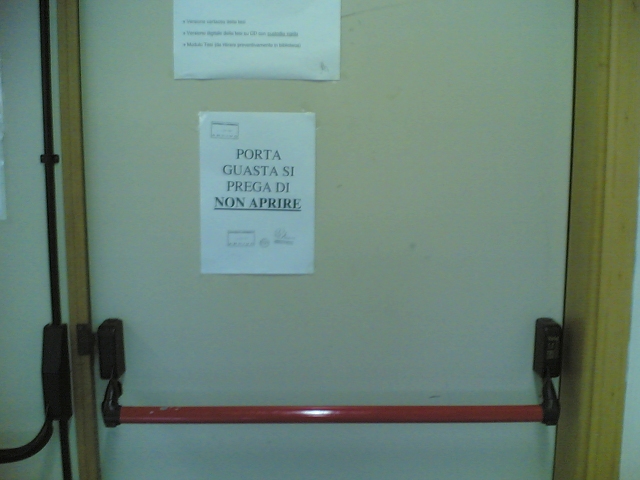 è *l'unica* porta della sala lettura, e dall'interno è stato affisso quel foglio. Mi chiedo: come faremo ad uscire?