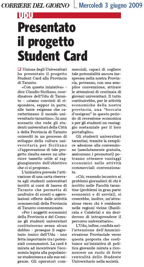 L'UDU – Unione degli Universitari- ha presentato il progetto “Student Card” alla Provincia di Taranto. "Con questa iniziativa" - dice Claudio Siciliano, coordinatore dell'UDU di Taranto - "siamo convinti di rispondere, seppur in parte, alle tante esigenze che caratterizzano il mondo universitario tarantino. In uno scenario che vede gli studenti universitari della Città e della Provincia di Taranto coinvolti in un processo di sviluppo della cultura universitaria, riteniamo che l'approvazione di tale progetto risulti essere un ulteriore tassello utile al raggiungimento dell'obiettivo che ci si propone. Il progetto prevede l'attivazione di una carta riservata agli studenti universitari iscritti presso i corsi di laurea di Taranto che permetta di usufruire di sconti o agevolazioni offerte dalle attività commerciali della Provincia di Taranto convenzionate. Per i soggetti economici della Provincia e del Comune gli studenti universitari costituiscono senza alcun dubbio una fetta importante tra i potenziali consumatori. La card è mirata ad incentivare l’economia legata alla popolazione studentesca e alle sue esigenze. Gli operatori commerciali, capaci di cogliere tale potenzialità ancora inespressa nella nostra Provincia, potranno, con una semplice convenzione, attirare le attenzioni di centinaia di giovani universitari. Il tutto costituirebbe, per le attività economiche della nostra provincia, una “boccata d’ossigeno” in questo periodo di recessione economica e per gli studenti un vantaggio sostanziale per il loro portafoglio. Infatti, gli studenti universitari tarantini, tramite la semplice adesione alla convenzione (assolutamente gratuita) potranno ottenere vantaggi economici presso le attività commerciali. Venendo incontro ai problemi giornalieri di chi è iscritto presso le Facoltà tarantine (problemi in gran parte economici e di servizi), si creerebbe, inoltre, un’attrazione verso chi è residente nelle regioni vicine (Basilicata e Calabria) e sia desideroso di intraprendere il percorso universitario. L'UDU confida nell'attenzione dell'Amministrazione Provinciale verso questa proposta che costituisce un’iniziativa di politica giovanile mirata a riconoscere un ruolo di forte centralità dello Studente Universitario nella società.”