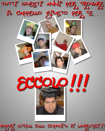 AUGURI CATALDO!!!!!!!! BELLISSIMA LA TUA TESI SUI DISPOSITIVI IRDA (uhaahuauh) Cmq, mi di spiace per non esserci stato alla tua laurea ma l'influenza mi ha bloccato a casa...come ti becco ti farò anche gli auguri di persona! auguri ancora! |