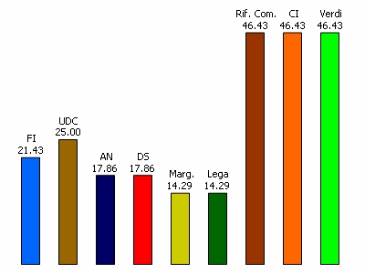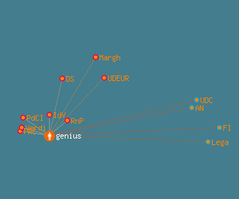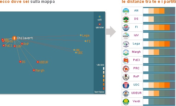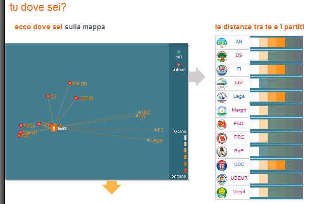 Pinux tu sei "vicino" a RNP UDEUR VERDI PdCI DS... Non devi vedere la distanza...ma l'istogramma (o come cacchio si chiama ) accanto al grafico Piu diventa rosso, piu sei lontano... Piu' i rami sono corti, piu' sei vicino a quel partito...capi'?  Questo test è pilotato! Trae in inganno!!!