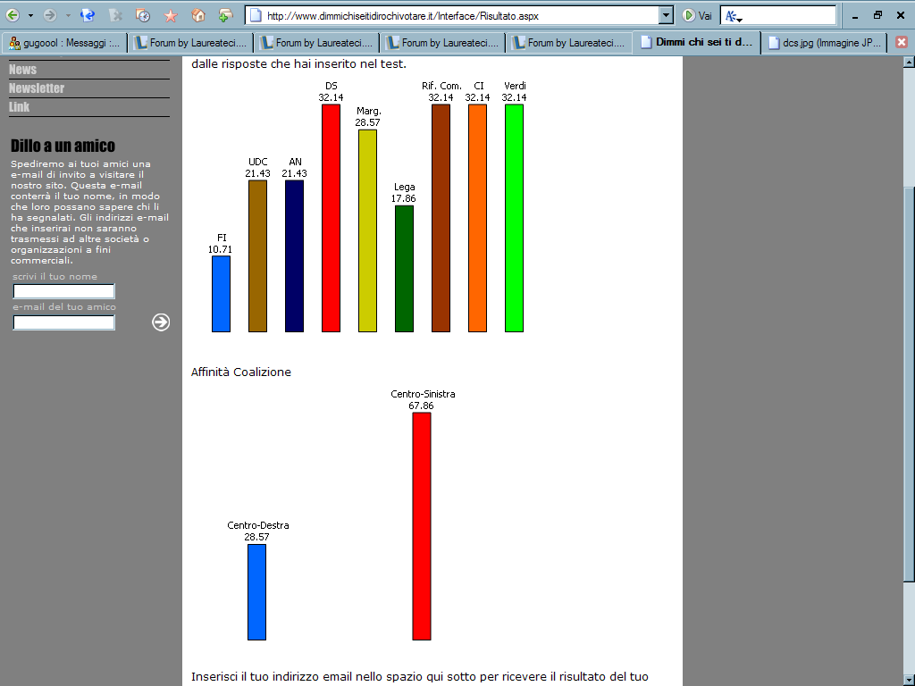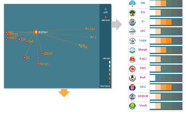 Pinux tu sei "vicino" a RNP UDEUR VERDI PdCI DS... Non devi vedere la distanza...ma l'istogramma (o come cacchio si chiama ) accanto al grafico Piu diventa rosso, piu sei lontano... Piu' i rami sono corti, piu' sei vicino a quel partito...capi'?  Questo test è pilotato! Trae in inganno!!! |