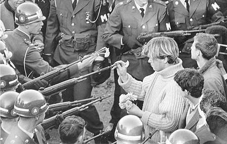 GUERRA DEL VIETNAM - La sua fotografia più famosa, scattata nell'ottobre del 1967, in piena guerra del Vietnam, durante una manifestazione pacifista a Washington, rappresenta un giovane manifestante che introduce dei fiori nelle canne di fucile dei soldati."